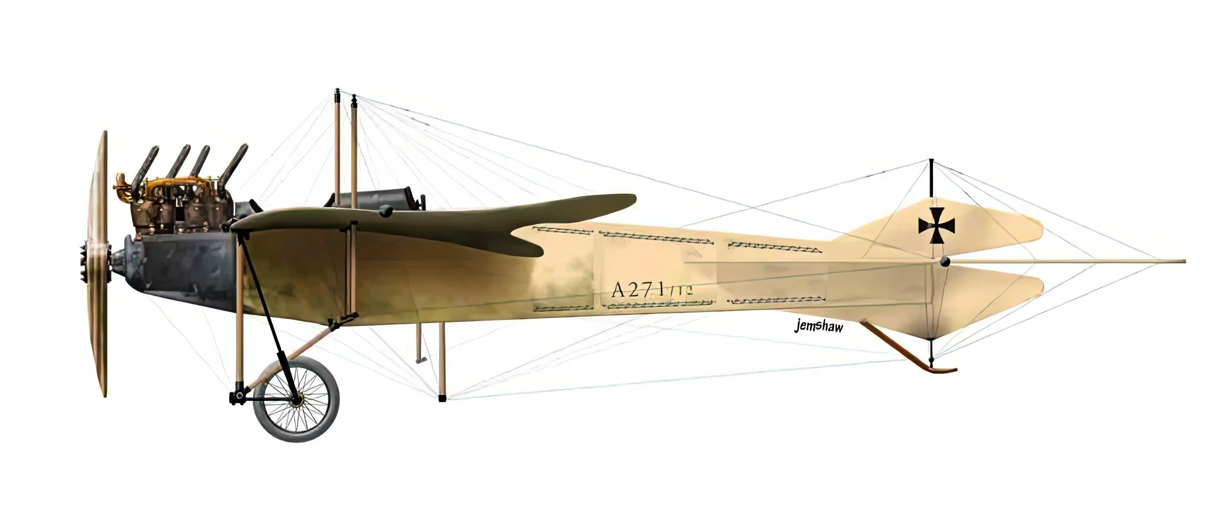 I confess that this one was slightly rushed and almost certainly inaccurate. The Taube was made by a great many manufacturers, all of whom seem to have made their own modifications. Many appear to have a six-cylinder engine, but I believe the original fitment was a four-cylinder Mercedes. This is the unit I've selected, but I had some difficulty finding good illustrations of its left-hand side. The routing of the exhausts is anyone's guess, so I've pointed them skyward and hoped for the best. The forward cowling is also a best-guess job.